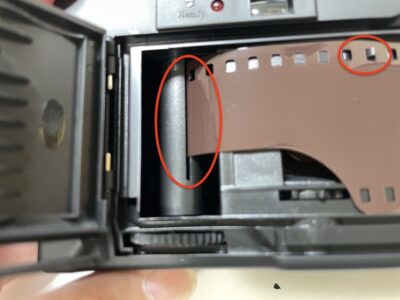 そしてフィルムをセットし、先をカメラの左側の溝に差し込みます。