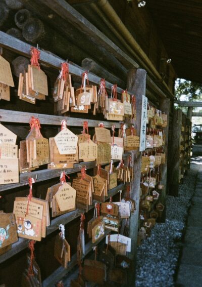 5枚目の写真は日本の神社で撮りました。絵馬と少し青みがかっているコンクリートのコントラスがいい感じです。
